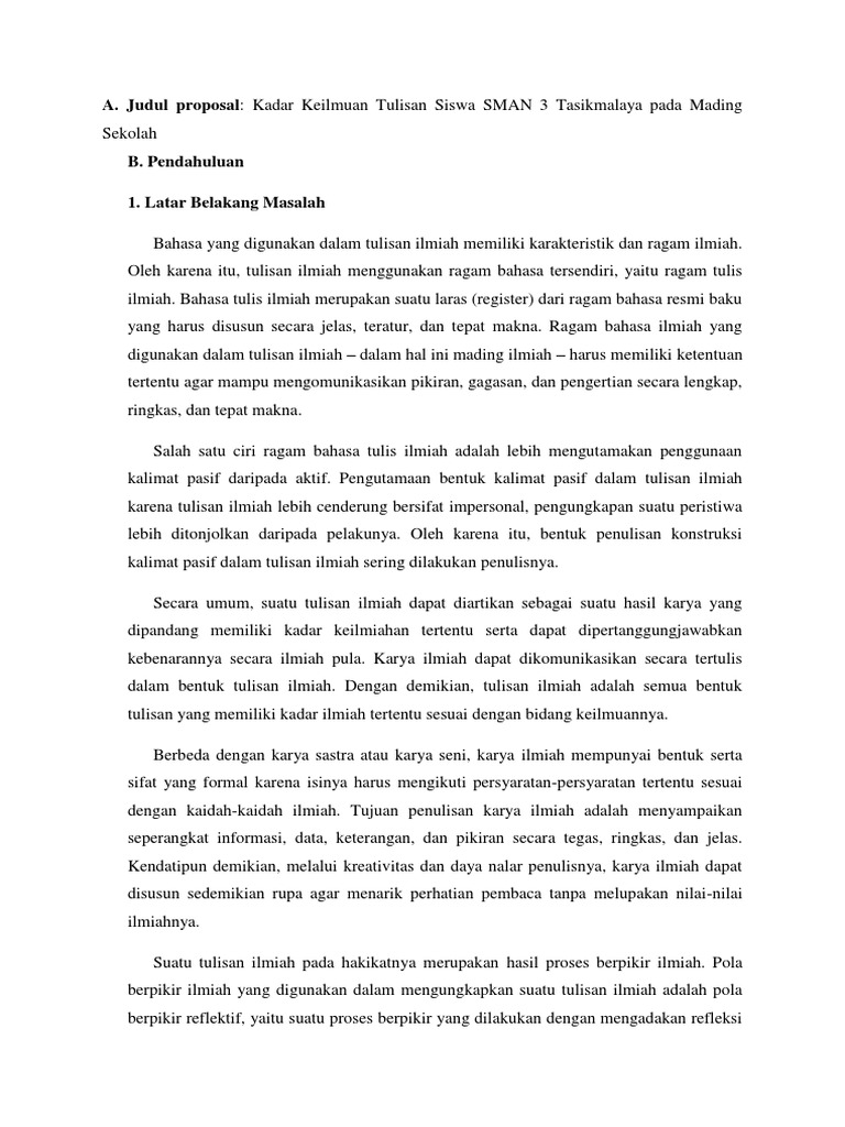 Organisasi siswa intra sekolah (osis) sma negeri 10 malang akan menyelenggarakan kegiatan pensi yang ditujukan kepada seluruh masyarakat pada kegiatan pentas seni (pensi) ini, sma negeri 10 malang mengangkat tema yaitu tempo doeloe yang memberikan kesempatan bagi para siswa. Karangan ilmiah adalah karangan ilmu pengetahuan yang menyajikan fakta dan ditulis menurut metodologi penulisan yang baik dan benar. Dalam proposal harus dijelaskan lama waktu pekerjaan itu akan diselesaikan. Perumusan masalah informasi penting : Didukung jaminan masih memiliki kadar objektivitas rendah. Bahasa yang digunakan dalam tulisan ilmiah memiliki karakteristik dan ragam ilmiah. Untuk menunjang pemahamanmu, perhatikanlah contoh proposal berikut ini! Sehubungan dengan hal itu, perlu diadakannya tinjauan terhadap karya ilmiah siswa smk al wafa, untuk mengetahui kadar keilmuannya. Kadar keilmuan tulisan siswa sman 3 tasikmalaya pada pendahuluan 1. Oleh dosen pendidikan 2 diposting pada 02/07/2021. Untuk mengetahui kadar keilmuan tulisan siswa melalui kajian terhadap karya ilmiah yang dibuat oleh sma negeri 3 tasikmalaya. Islam pada umumnya dan iain salatiga pada khususnya. Sehubungan dengan hal itu, untuk mengetahui kadar keilmuan tulisan siswa maka perlu dilakukan kajian terhadap karya ilmiah yang dibuat siswa sma negeri 3 tasikmlaya.